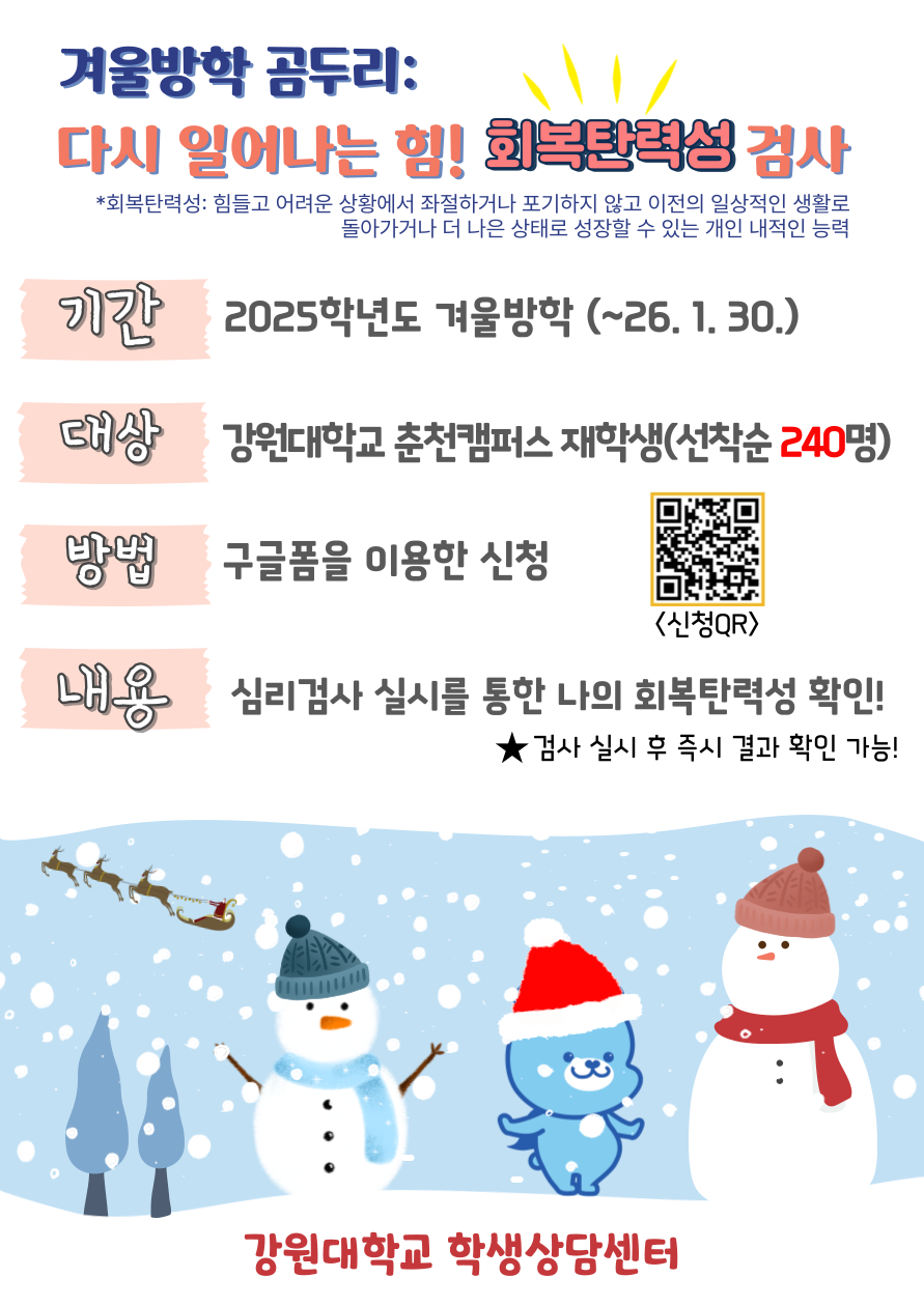 학생상담센터에서는 아래와 같이「겨울방학 곰두리: 다시 일어나는 힘! 회복탄력성 검사」를 운영합니다.